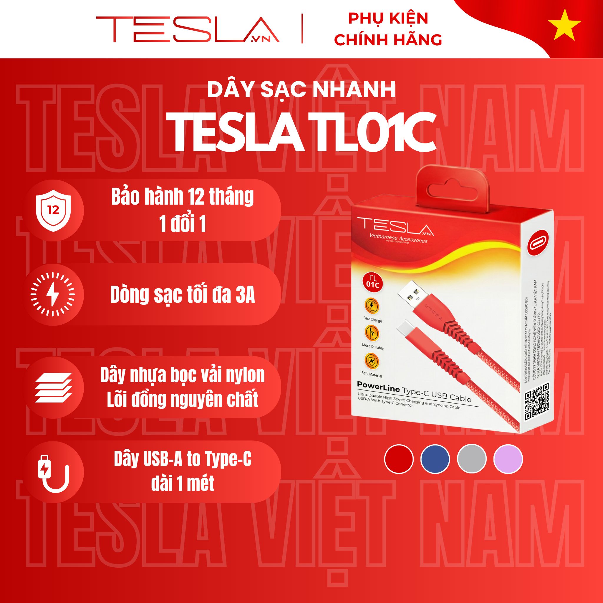 - Dây cáp sạc nhanh USB to Type-C Tesla TL01C
